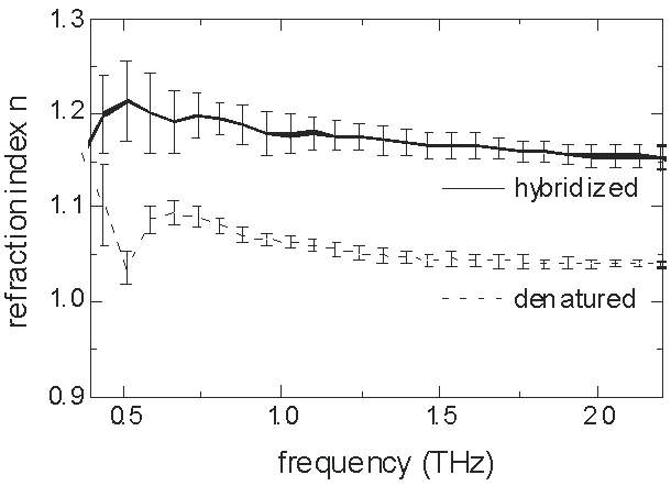 Our first experiment demonstrates, that it is indeed possible to distinguish two DNA samples consisting of the same source material but once being hybridized and once being denatured. They were dropped onto a sapphire substrate, dried and subsequently analyzed by time domain THz spectroscopy. As a result, it can be seen, that the time delay of a THz pulse through the hybridized sample is bigger than through the denatured sample. Described as refractive index (Fig. 2) this is a higher value for the hybridized sample over a broadband frequency range. The sensitivity of this experiment cannot compete with conventional methods. It can rather be seen as a proof of principle, that the binding state of DNA can be probe by THz spectroscopy without any further marker labels.