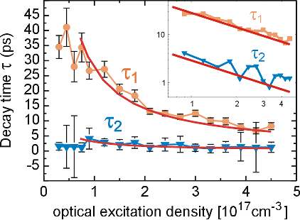 These experiments demonstrate for the first time these two different relaxation components observed by THz transmission spectroscopy. Fig. 2 shows the decay times of both components depending on the respective optical excitation density. Both components have a similar exponential decrease for increasing density.