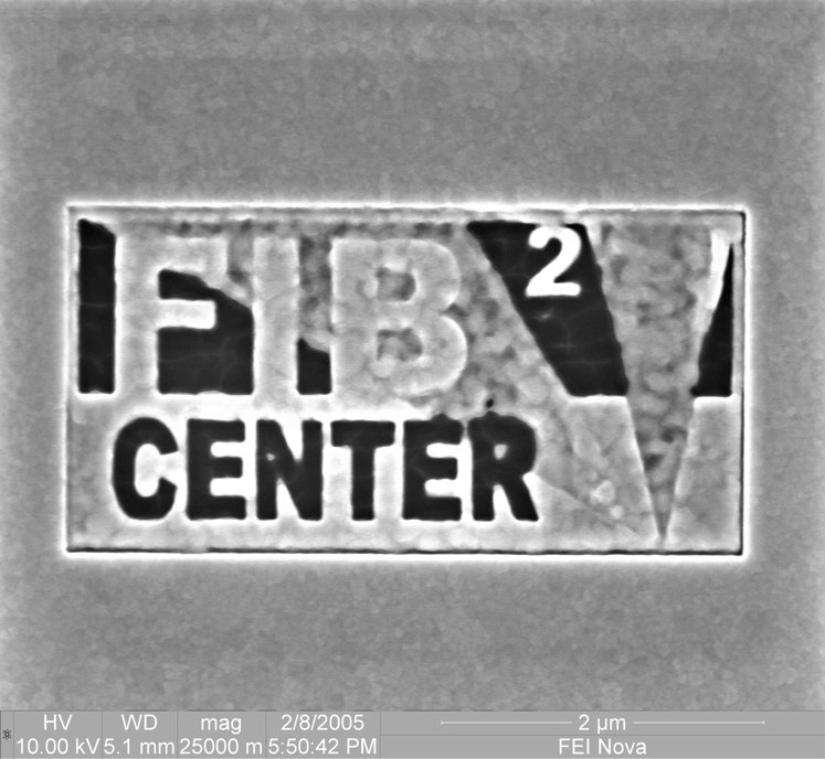 Two examples for FIB manufacturing left: Logo of the FIB2Center milled in a gold layer on silicon right: FIB-milling of a gold layer on silicon simultaneously observed with SEM
